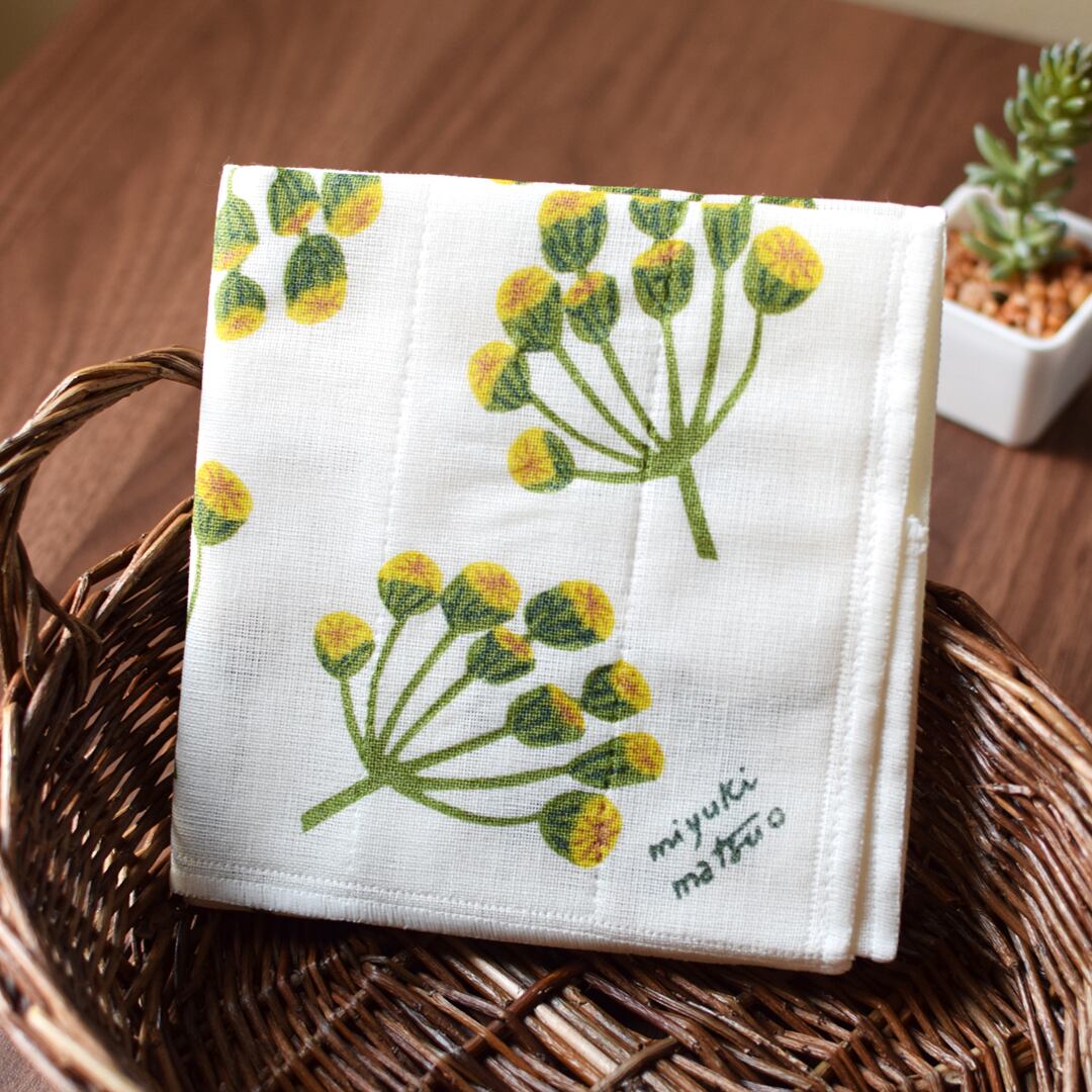 イラストレーターの松尾ミユキさんが描く、ミモザのイラストがかわいらしいかやふきん。
